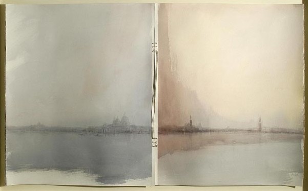 Seis Menciones de Honor en las exposiciones de la Asociación Española de Acuarelistas y Primer Premio en la XIX edición; Premio Nacional de Acuarela en 1990, premio Ejército 1996, entre otros galardones…Su exploración de los formatos “extremos” (que al fin y al cabo obedece a una fascinación por la inmensidad, por el vértigo y no a un mero afán de elegancia) es bien conocida y en esta muestra, en la que podremos contemplar tres polípticos convertidos en escultura, en “bosque de acuarelas”, se abren nuevas vías de investigación y nuevas e insospechadas posibilidades para la “hermana pequeña” de la pintura…Juan Díaz pinta el vértigo que nos produce la inmensidad del paisaje: es el viajero que otea el horizonte, que se encarama a las lomas o que se acerca al mar. Como escribió Juan Antonio Tinte, “La anchura de los territorios, la traza horizontal, la temperatura y complementariedad de los tonos, hacen de esta pintura un remanso donde la realidad descansa de si misma sin alterar su esencia”. Entre los cuadros más sugestivos de esta exposición están por ejemplo los frutos de su viaje a la Patagonia y la Tierra de Fuego: desde la ventana de un hotel abandonado en el Cabo de San Pablo contempla el gran casco varado del Desdémona, y el faro herrumbroso e inclinado a la entrada del Estrecho de Magallanes; y tras él, la llanura infinita, la nada y el frío (puede pintarse la soledad y aún la inmensidad pero, ¿y el frío?)…Pocas piezas de esta serie nos han llegado, desafortunadamente, porque la que era su tercera exposición en Buenos Aires fue un éxito rotundo. Entre sus temas preferidos están también las panorámicas de Venecia, envueltas en brumas (“Venecias románticas en las que las brumas se hace acorde musical con sonido quejumbroso de oboe vivaldiano. El tiempo viejo, el tiempo ausente, el tiempo del silencio hecho color…”, escribe también Antonio Gascó) y las playas del Sur de Francia (como el soberbio “Playa de Hendaya”, tan prodigo en detalles y a la vez tan vacío) y del País Vasco. Y más allá, una serie de temas asturianos: montañas blancas que en ocasiones toman forma de políptico y en la que descubrimos una vez más al mejor Juan Díaz, al pintor de trazo suelto, que no teme al gesto azaroso porque sabe que para el acuarelista- más que para el pintos de óleos – está escrito el quincuagésimo-y último – secreto de Dalí “Nada de esto te servirá de nada si tu mano no está guiada por un ángel”.